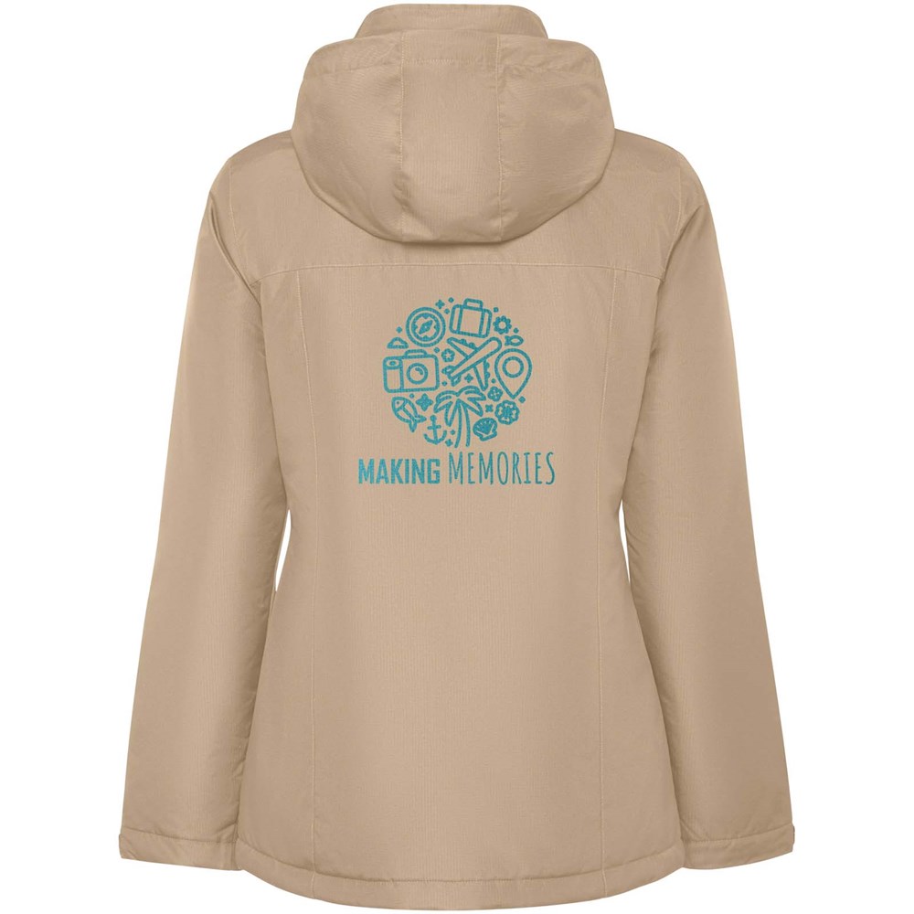 Waterdichte gewatteerde parkajack voor dames. Slanke pasvorm. Hoge kraag met omgeslagen en afneembare capuchon met klittenbandsluiting. Bijpassende centrale rits met flap. Zijzakken met rits en vaste klep. Binnenzak met klittenbandsluiting. Verstelbare manchetten met riemlus met klittenbandsluiting. Interne toegang voor verstevigingen op de rug en linkerborst.
