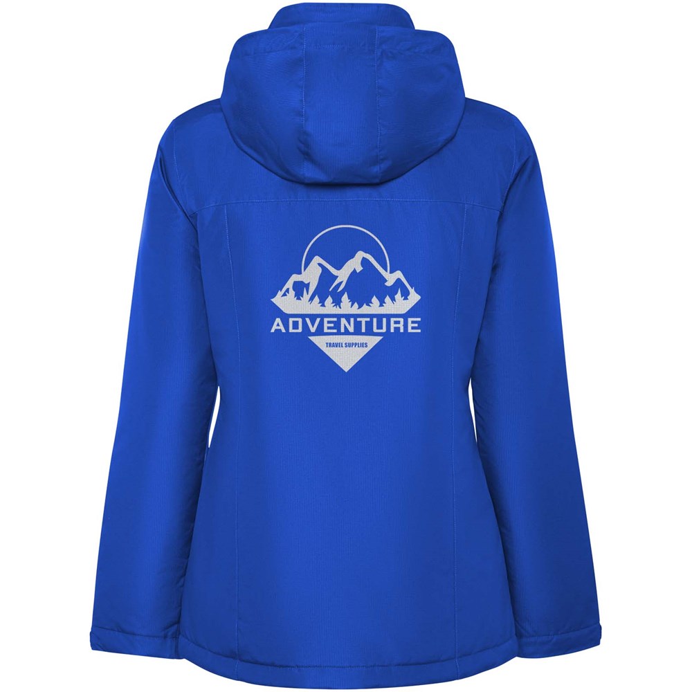 Waterdichte gewatteerde parkajack voor dames. Slanke pasvorm. Hoge kraag met omgeslagen en afneembare capuchon met klittenbandsluiting. Bijpassende centrale rits met flap. Zijzakken met rits en vaste klep. Binnenzak met klittenbandsluiting. Verstelbare manchetten met riemlus met klittenbandsluiting. Interne toegang voor verstevigingen op de rug en linkerborst.