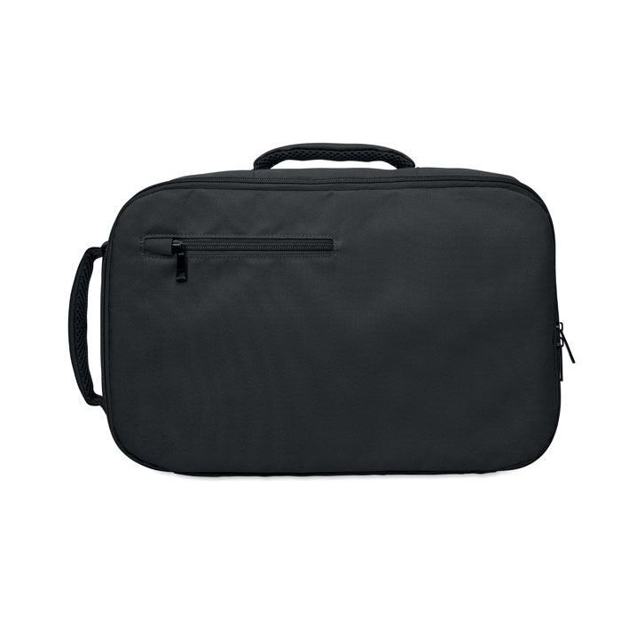 Handbagage rugzak van 600D RPET polyester met 180° opening. Voorzien van een hoofdvak met twee open vakken, mesh indeling, gewatteerd 15'' laptopvak en bagageriem.