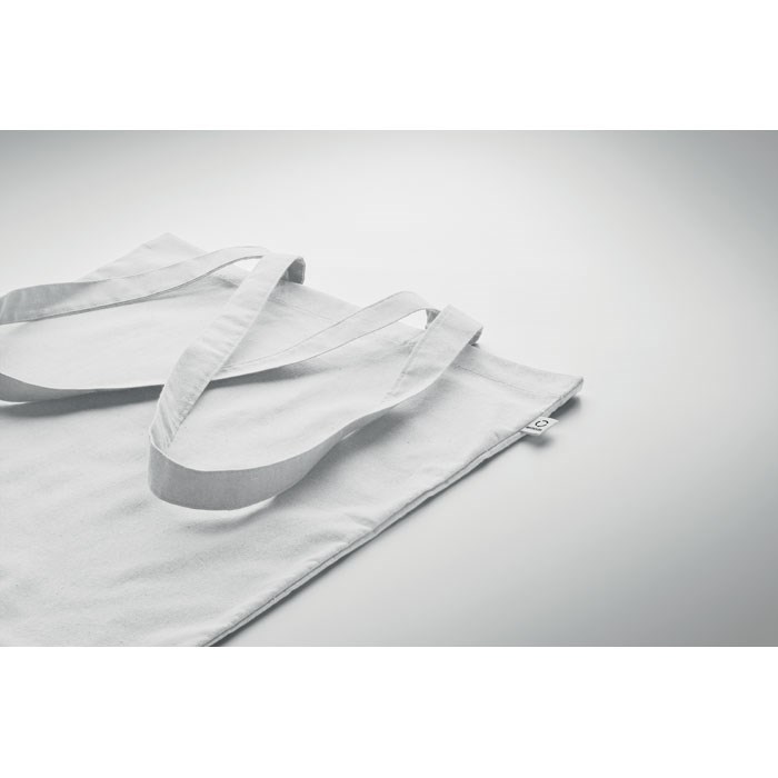 Gerecyclede pre-consumer katoenen boodschappentas (70% gerecycled katoen en 30% RPET) met lange hengsels. 140 gr/m². Dit artikel kan krimpen na het afdrukken.