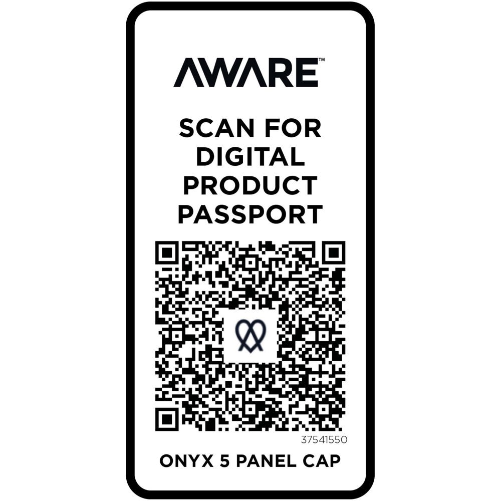 De Onyx 5 panel cap is gemaakt van 70% gerecycled katoen en 30% gerecycled polyester. Hij is ontworpen voor een comfortabele pasvorm met een hoofdomtrek van 58 cm en de metalen gespsluiting zorgt voor eenvoudige, veilige aanpassingen. De cap bevat Cyclo® gerecyclede vezels waarbij voorgesorteerd afval wordt gebruikt dat de kleur van het garen bepaalt. Deze vezels verminderen niet alleen de vraag naar nieuwe grondstoffen, maar tonen ook een engagement voor een circulair leven, waarbij ze de essentie belichamen van het verminderen van afval en het bevorderen van een gesloten kringloopsysteem. Elke cap wordt ook geleverd met een Aware™ tracer. Met deze innovatieve functie kunnen gebruikers de oorsprong en de reis van hun artikel volgen via een QR-code, waardoor de transparantie in de toeleveringsketen wordt vergroot en er een sterkere band is tussen het product en het productieproces.
