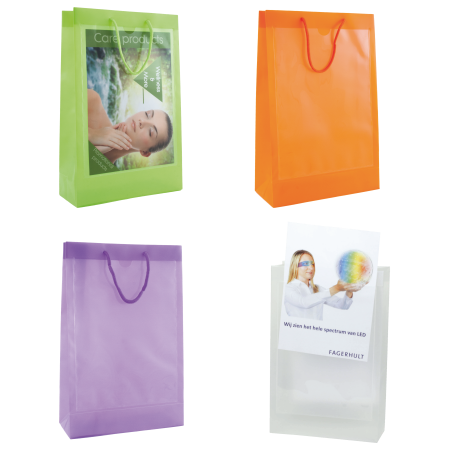Transparante polypropylene tas recyclebaar 260 x 400 x 100 mm, met koord 5 x 150 mm en 2 vensters met A4 inlay